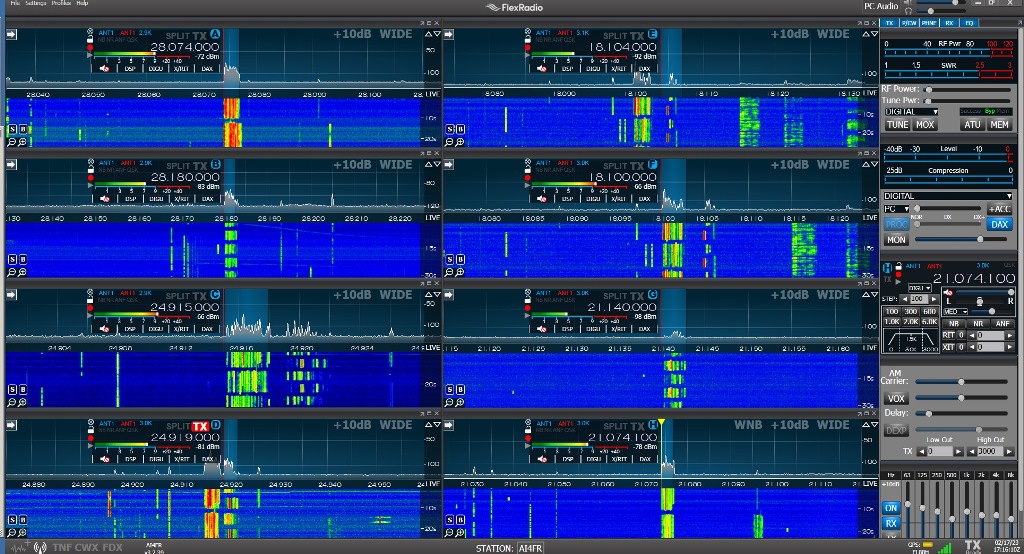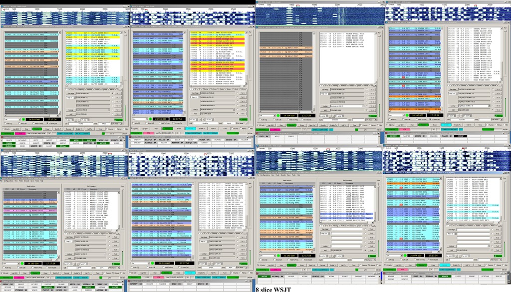 The picture below is how I accomplish the 8 slices aka 8 instances of WSJT. The Flex 6700 allows for 8 receivers to be in operation at one time. The Flex is attached to an SPE Expert Linear 1.5k Series 2 which has a lightning fast auto tuner. In the picture below the 12m band is the active TX slice. To make any other band active I simply click on the TX above and to the right of the frequency. That instanly changes the band and amplifer(antenna tuner) and I am ready to go. From there I would double click a call sign in WSJT. In short, 3 mouse clicks and I am calling a station on another band and if need be also employing the amplifier. I run similar configurations for other modes such as CW, SSB, etc. Beware of buggy Flex software and their updates.