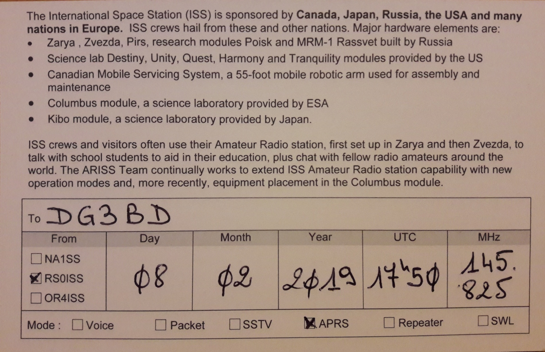 QSl Card from the ISS