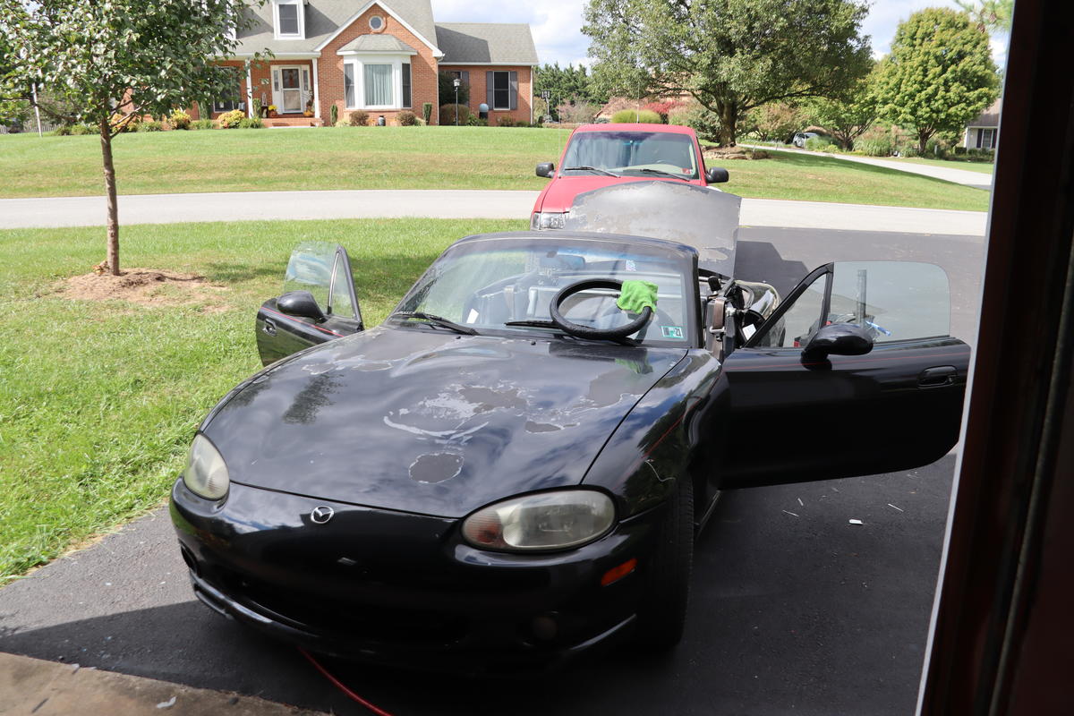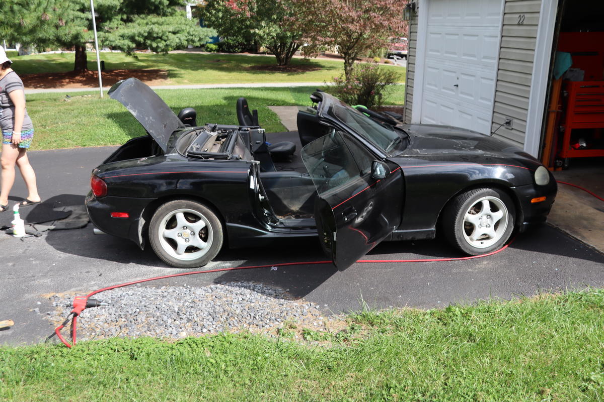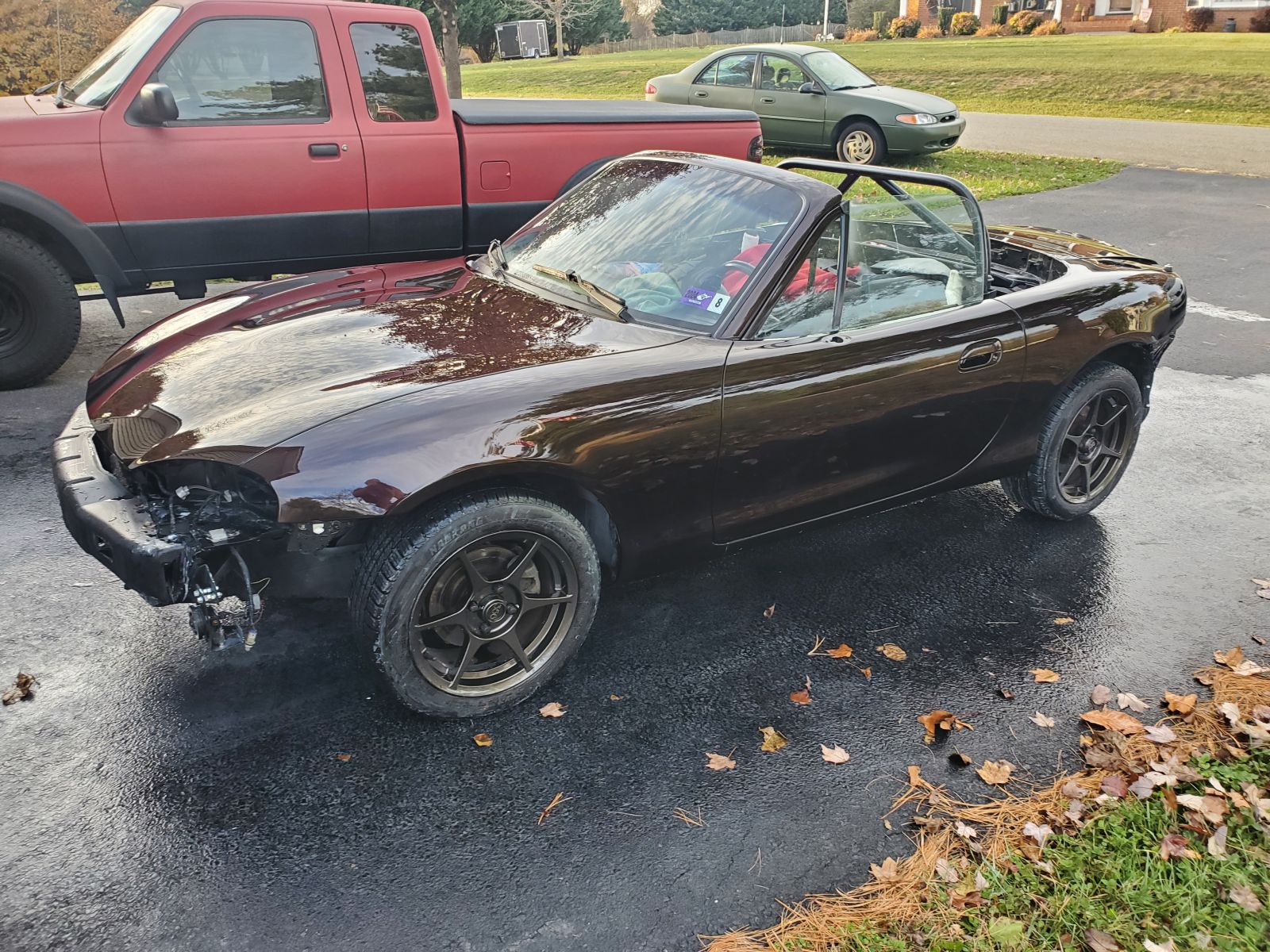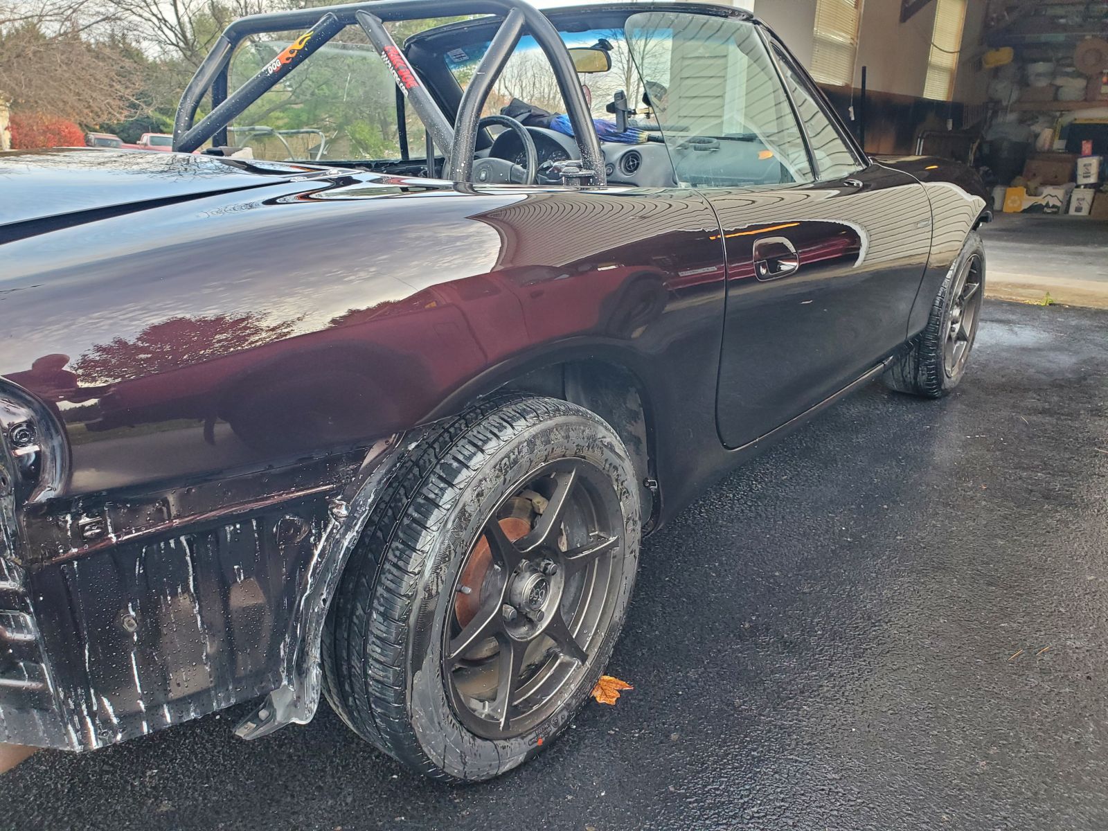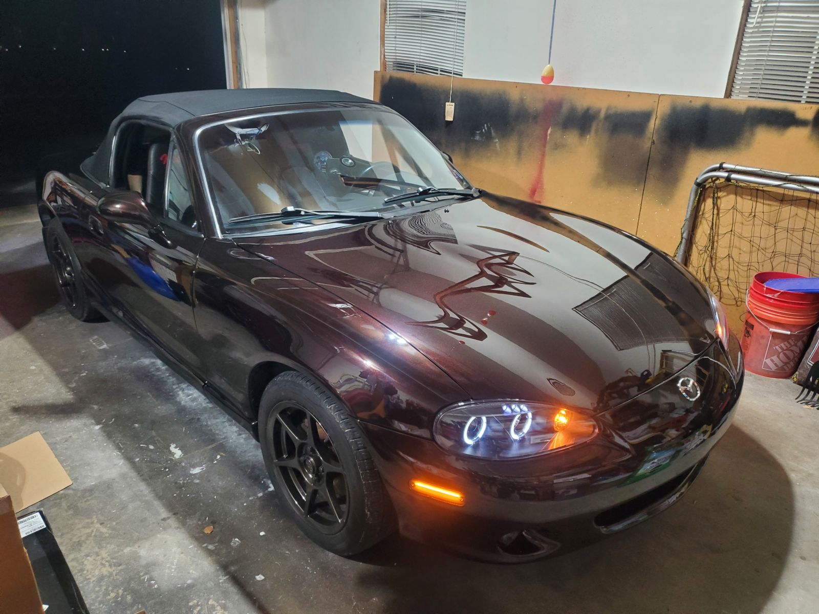 I sanded down the Miata did some body work then painted it in my garage, 3 coats of Black Cherry Metalic Pearl, 3 coats of clear then wet sanded it down and buffed it out replaced the front headlamps and installed LED marker lights.
