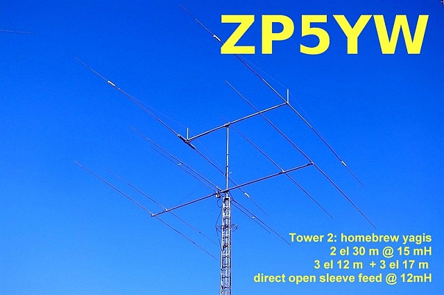 Tower 2: (self supporting 12 meters high) homebrew 6 elements dual-monoband yagis, 3 el for 12 meters + 3 el for 17 meters with open-sleeve direct feed @ 13mH, 2 elements coil loaded yagi for 30 meters (derived from a 40m yagi) @ 16mH.