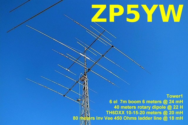 Antenna system: Tower 1: (self supporting 20 meters high) HyGain TH6DXX @ 20mH (10-15-20 meters), 40 meters coil-loaded rotary dipole @ 22 mH, homebrew 6 el 7m boom yagi for 6 meters @ 24mH. Inverted V dipole for 75/80 meters.